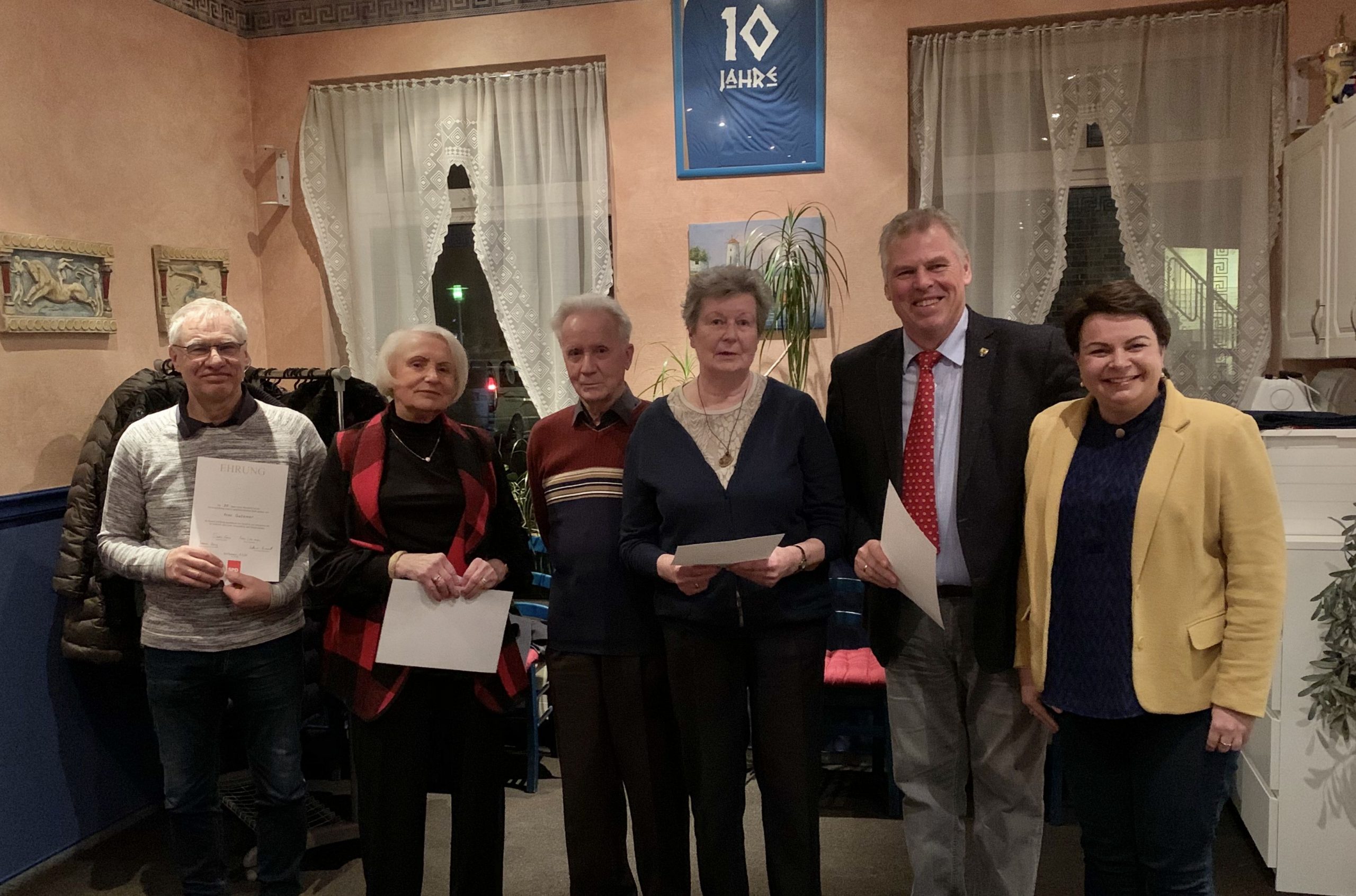 Neun Mitglieder des Ortsvereins können bereits auf 30 Jahre in der SPD zurück blicken. Sie wurden auf der Versammlung besonders geehrt. Der Rückblick auf die Zeit des Mauerfalls rief bei allen Anwesenden das Geschehen in dieser aufregenden Zeit wieder ins Gedächtnis. Aufmerksam wurden auch die Darlegungen über die Aktivitäten der Mitglieder des Ortsvereins auf allen politischen Ebenen verfolgt. Im gemütlichenn Teil des Abends gab es vielfältige Gespräche in kleineren Gruppen „über Gott und die Welt“. Natürlich machten wir uns auch Gedanken darüber, wie es in der SPD weiter gehen soll, auch darüber, ob das richtige Duo an der Spitze unserer Partei steht.